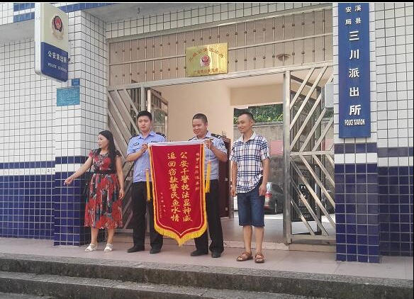 四川新闻网广元7月26日讯(邵志海 文/图)7月25日上午,苍溪县龙王场居民向皓请来秧歌队,敲锣打鼓,将写有“追回窃款警民鱼水情,公安干警执法显神威”的锦旗一面送到苍溪县公安局三川派出所,以示感谢。