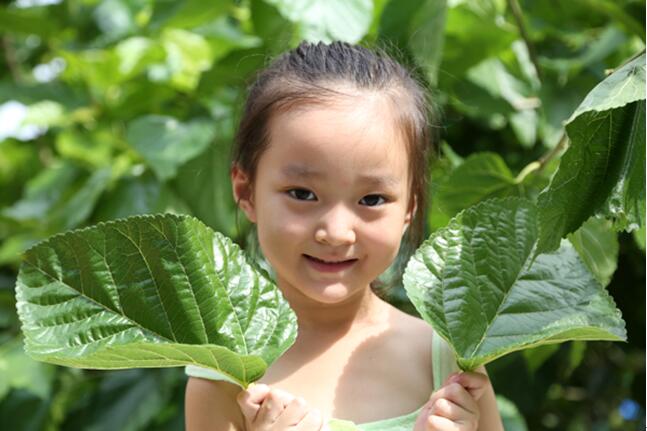 “这么大的桑叶啊!这么光鲜,是打了药的吧?”孩子们在朝天区蚕业局党支部书记高建明的指导下,来到密密的桑林里,摘取桑叶。