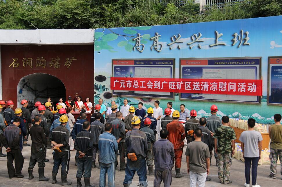 四川新闻网广元8月9日讯(乔大海 文/图)8月4日,广元市总工会党组书记、常务副主席何开金,副主席许明烽一行顶烈日、冒高温,前往广旺能源集团公司石洞沟煤业公司开展“送清凉”活动,慰问井上和煤井下职工526名,并为奋战在高温岗位一线矿工送去水杯、洗衣液、毛巾、肥皂等价值20000元慰问物资,送去党和政府以及工会组织的亲切关怀。