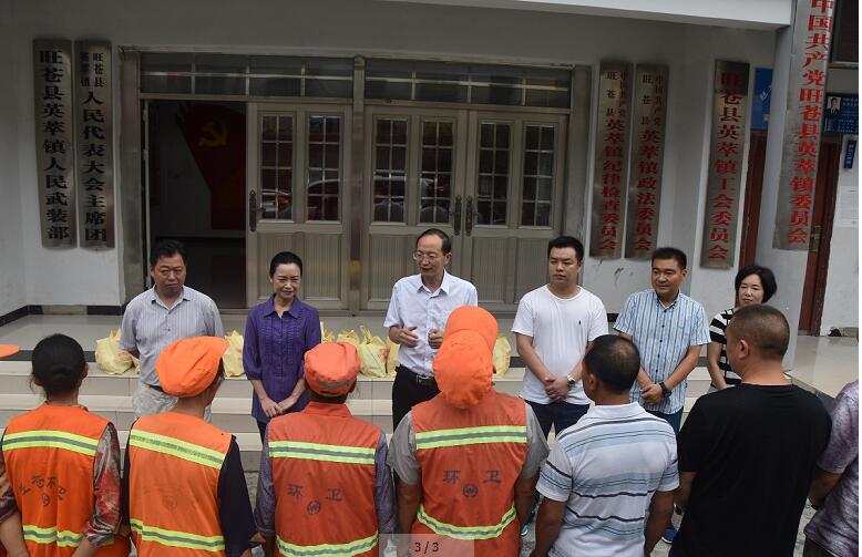 一大早,何开金一行在英萃镇政府院内集中为村社干部代表和环卫工人送上香皂、洗衣粉、藿香正气液、花露水等清凉消暑用品,向在高温下仍坚守岗位的环卫工人表示感谢,希望大家注意防暑降温,发扬吃苦耐劳的精神,为助力脱贫攻坚做出更大贡献。