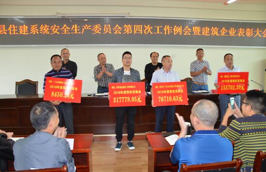 会上,局党组成员、副局长李泽禾宣读了剑阁县人民政府关于表扬2016年贡献突出建筑业企业的通报。为激励全县建筑业争先进、创一流,充分发挥龙头骨干企业的引领作用,推进剑阁县建筑业持续健康发展,县人民政府授予剑阁县第二建设有限责任公司为“剑阁县建筑业龙头企业”、授予四川省广元市金益建设工程有限责任公司为“剑阁县建筑业骨干企业”、授予四川省易达建筑工程有限公司为“剑阁县建筑业优秀企业”。同时,对该县税收做出卓越贡献的本地建筑企业兑现了税收奖励资金。接着,局党组成员、局纪检组长魏文安排部署了第四季度安全大检查工作。