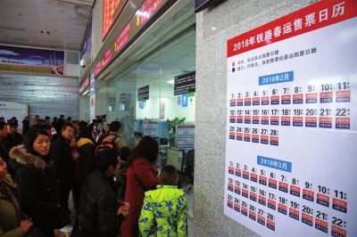 昨日上午,记者来到广元火车站实地走访,一进售票大厅,张贴在售票窗口旁的2018年铁路春运购票日历十分醒目,日历用醒目的图标标注了网络购票、电话购票的预售期与车站售票窗口、火车票代售窗口的预售期的差异,方便旅客合理安排购票。