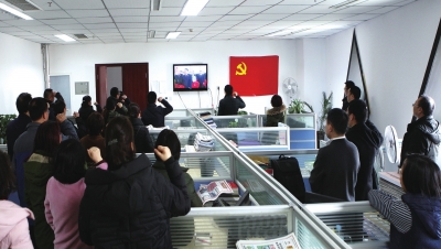 | 2月22日下午,广元日报社组织党员干部职工收看全市作风纪律深化年动员大会直播,图为党员重温入党誓词。广元日报记者 唐彪 摄 |