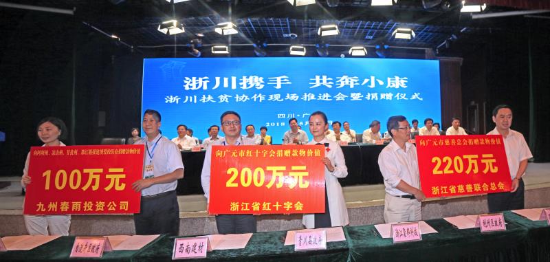 在浙川扶贫协作现场会上,浙江省红十字会向广元市红十字会捐赠资金物资200万元,浙江省慈善联合总会向广元市慈善会捐赠220万元,九州春雨投资有限公司,向阿坝州、甘孜州、凉山州等地捐赠100万元。同时,现场还签约了一批浙川两地的帮扶和经贸合作项目,总金额达166.6亿元。