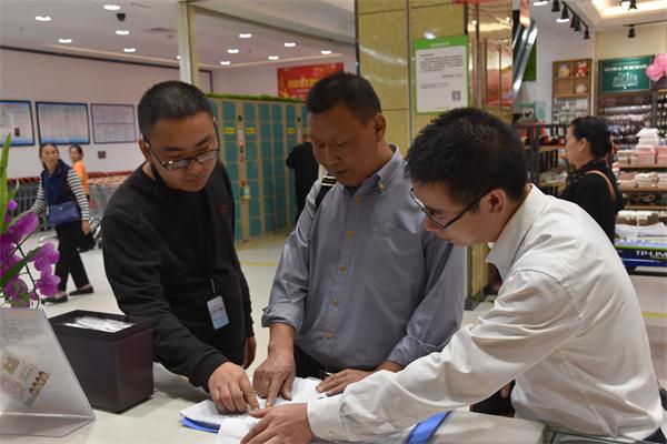 督察组在超市检查购物卡办理情况(刘玥摄)