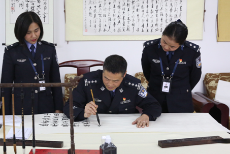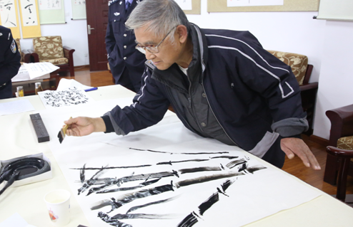 伴随着优雅婉转的古琴曲声,来自全狱的书画爱好者齐聚一堂,挥豪泼墨,歌颂改革开放四十年来祖国的巨大变化。活动现场,大家兴致高昂,许忠平、吕杰祥、陈治国、钟扬河书写了自创诗歌、“不忘初心”等多幅作品,楷书刚正不阿、行书潇洒飘逸、隶书典雅端庄。陈俊辉和黄先奎现场泼墨作画,《虾趣图》妙趣横生,《墨竹》苍劲有力。青年民警也初露锋芒,杨宇的硬笔、李霁的楷书,笔走龙蛇,翰墨飘香。一幅幅美丽的画卷,一张张俊逸的作品,充分展示了书画者们感恩祖国,感恩改革开放,热爱美好生活的良好精神风貌。