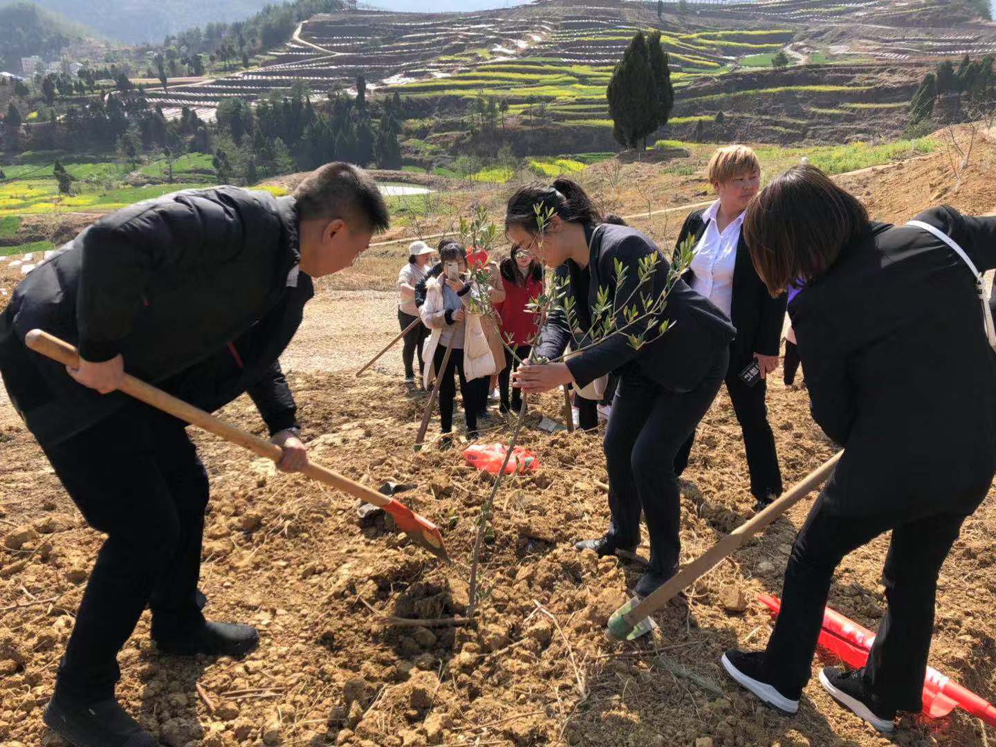 在工作人员的耐心讲解和亲身示范下,大家一起种下了第一棵小树苗。随后大家分工协作,挖坑的挖坑,拿树苗的拿树苗。你一锄头,我一铁锹,先将土壤和肥料充分拌匀,再撕下树苗根部的塑料膜,轻轻的放进坑里。一人用手扶着,两人负责回土,最后用铁锹轻轻地拍拍把土压实。不一会儿,大家就已经种完了一排。看着这一排挺拔的小树大家心里充满了成就感。这不是一颗颗普通的小树苗,而是充满了爱心和希望的小树苗。大家都期待着今天种下的这些小树苗能茁壮成长,在不久的将来成为促进当地经济发展,带动当地农民增收致富的好帮手!