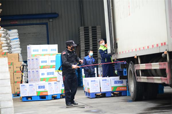 9点半,两辆大货车已满载货箱,等候车辆消毒后出发。