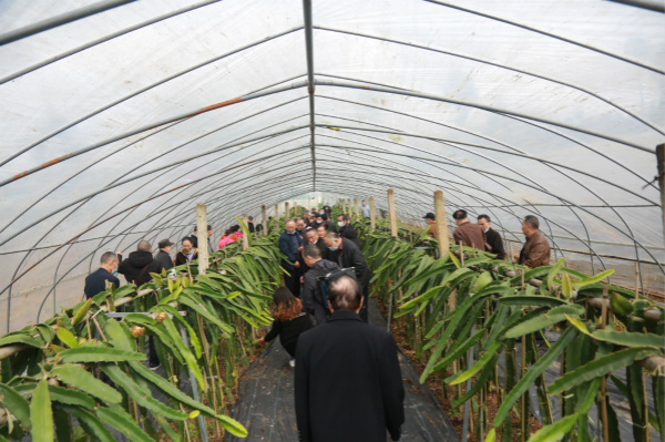 老同志一行来到剑阁凉山乡联合村拦马墙生态农业开发有限公司参观热带水果产业园。剑阁拦马墙生态农业开发有限公司负责人向退休老同志们详细介绍了园区发展情况、产品种类、发展规划等有关情况。