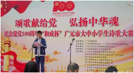 四川新闻网消息(张天波 汪江婷 记者李全民) “在党的百岁华诞来临之际,我为她歌咏,我为她祝福!值此“和成杯”大中小学生诗歌大赛,我要握紧手中的笔,为百岁华诞谱写一曲华美的赞歌。”广元中学张铭钊同学在3月30日广元市大中小学生诗歌大赛启动仪式上精彩发言。广元市中华传统文化研究会副主席兼秘书长冯登鉴主持启动仪式。