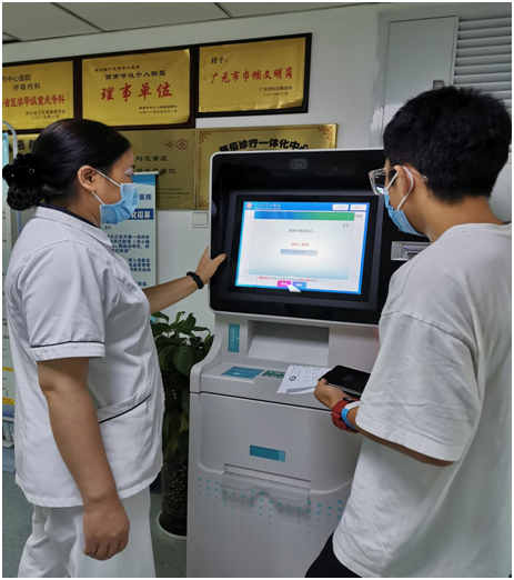 进入住院病区后,医院医保工作人员随即到病区“上门”服务办理医保手续。同时,住院病区均设置有出、入院“一体机”智能自助系统,患者任意凭身份证、社保卡、门诊号、住院号、电子健康卡,均可在“一体机”办理入院、出院缴费,打印住院清单。