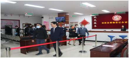 调研剑阁县民政局婚姻登记处时,卢攀登充分肯定剑阁县对婚姻登记工作的重视,2013年按照国家3A标准打造后的婚姻登记处,坚持传统与现代相融合,引入现代化科技技术,在智慧化智能化登记服务、婚姻家庭辅导服务、创新结婚登记颁证服务、举行集体婚礼、加强婚姻文化建设各个方面,切实提高群众获得感和幸福感。