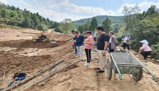图为龙源镇党委书记郭绍海(左一)检查施工进度及质量