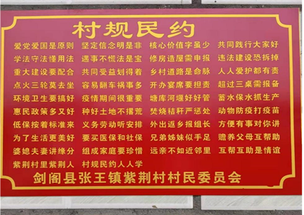 近年来,在剑阁县民政局、张王镇党委政府的指导下,紫荆村结合实际,通过“4+7模式”,历时三个月完成村规民约修订工作,形成一张独特的“名片”。