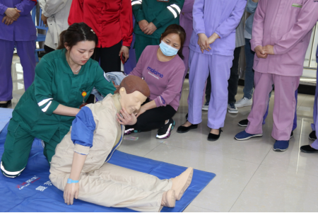 培训前,团委副书记钱炳宇强调了此次急救技能培训的重要性和必要性。从溺水、窒息、心脏病突发等疾病和意外事件时第一时间科学施救方法。急诊科郑丽君和何沅洁分别就心肺复苏和海姆立克急救法对后勤服务爱玛客工作人员及志愿者开展面对面的培训。