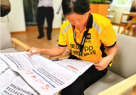 图为8月3日下午2点,美团职工李女士在“劳动者驿站”歇息读报 李全民 摄