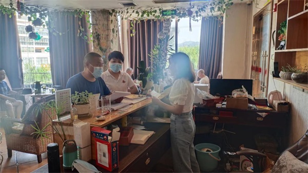 在嘉宇茶楼,检查组查看了每日消杀工作、员工健康监测工作情况,对茶楼部分人员未戴口罩进行了批评教育,对来人登记造册未及时更新和登记进行了提醒,要求业主杜绝应付思想、克服麻痹大意,并要求立即整改。