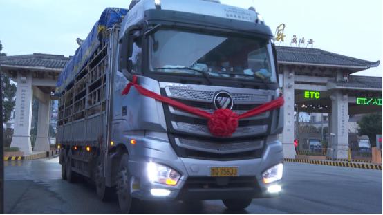 (图为:满载种牛的大货车驶出收费站)