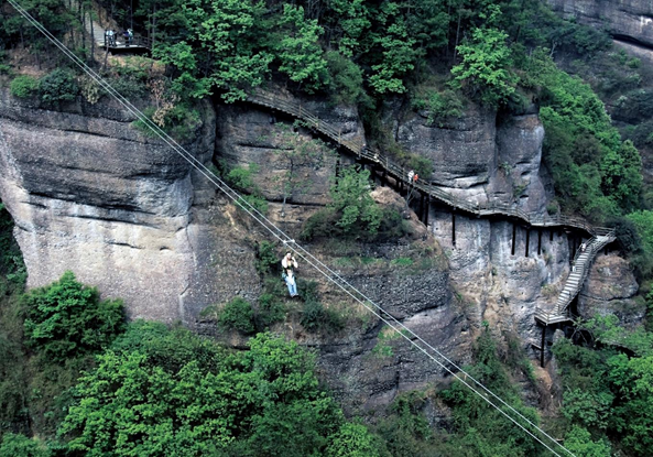 (游客从两峰之间“飞”过)