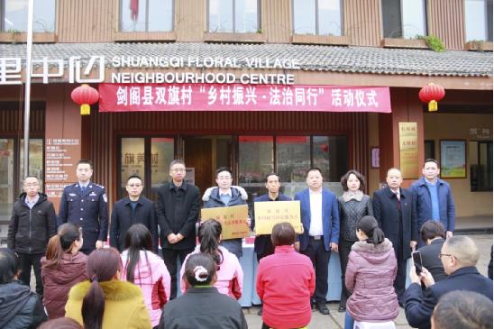 在市自然资源局党委委员、副局长王双梅和县委常委、政法委书记甘兴礼等相关部门领导的共同见证下,剑阁县法院院长舒强、剑阁县司法局局长刘三永与双旗村书记完成了“乡村振兴诉讼服务点”“乡村振兴公共法律服务点”的授牌仪式。
