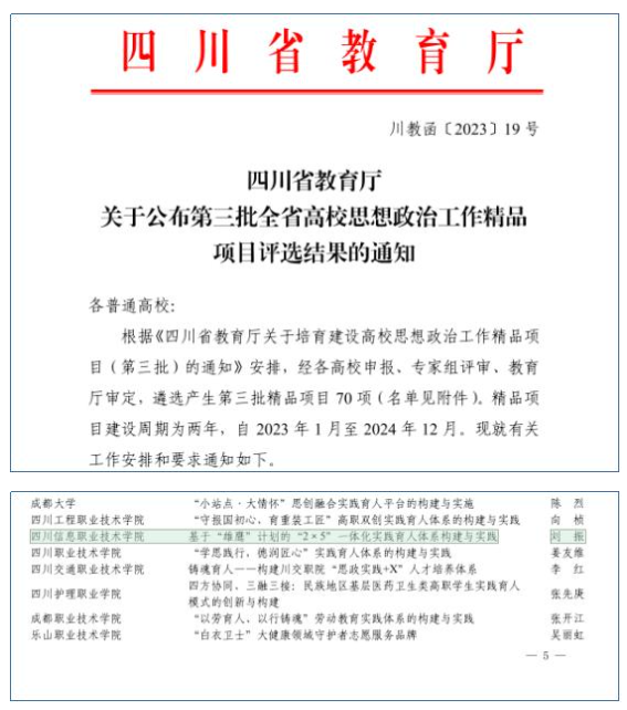 四川新闻网消息(王会杰 记者 李全民)近日,省教育厅公布了第三批全省高校思想政治工作精品项目评选结果,四川信息职业技术学院团委副书记刘振及其团队申报的《基于“雄鹰”计划的“2×5”一体化实践育人体系构建与实践》获批全省高校思想政治工作“实践育人”精品项目。