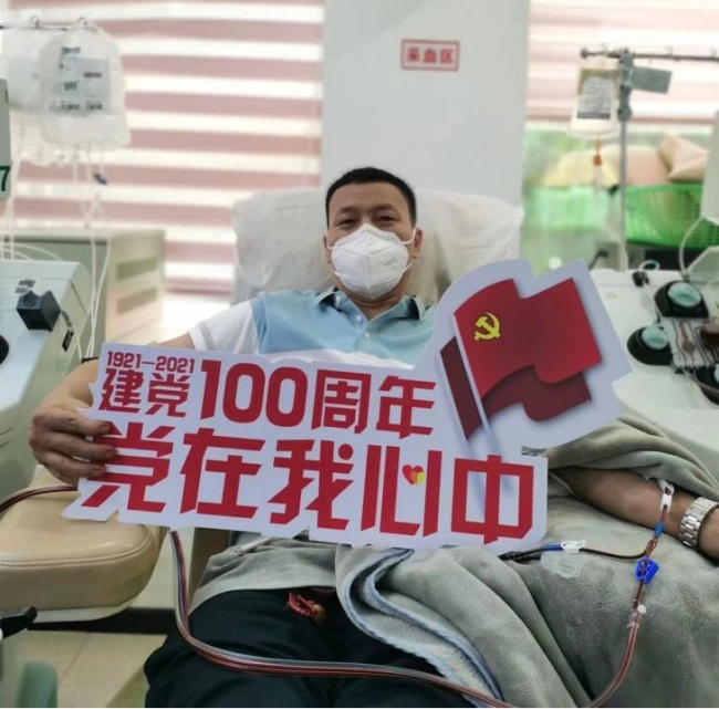 王作海告诉我,他最有意义的一次献血,是2021年“七一”期间。2021年7月1日,是庆祝建党100周年的纪念日。这期间,他在厦门市工作,他专门联系了当地血站,并成功在“七一”期间献血。献血时,他还特地做了一个牌子,上面有一面党旗和“1921—2021 建党100周年 党在我心中”的字样。