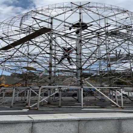 刚过澳援大桥,新会址入口处矗立的两个铁质大灯笼“骨架”着实吸引人的注意。走近后,记者见到,现场工人正忙碌着,有喷绘的、有搭架的、有焊接灯笼骨的、有搭建舞台的……