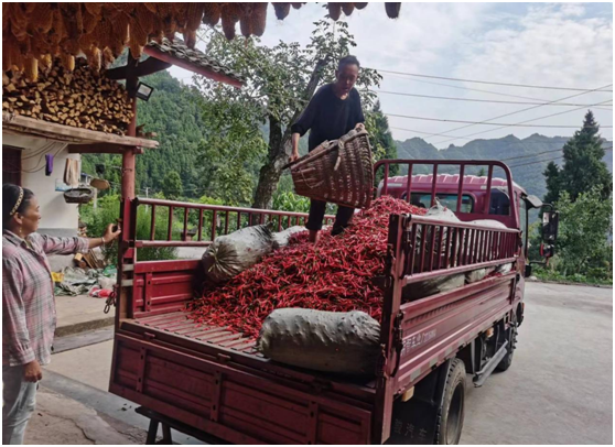 (图为村民正在打包运送、等待公司统一收购辣椒)