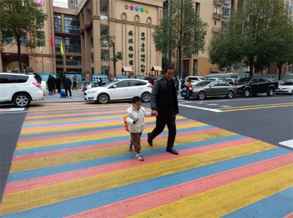 “好可爱哦,让人眼前一亮,这样醒目的颜色,家长接送小朋友就更加安全了。”途经此地的杨大爷指着斑马线说道。