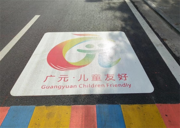 除此之外,记者还发现,在斑马线两侧喷涂有白底红字的 LOGO。 LOGO由一个“元”字变形而成,“元”字下面还有着“广元·儿童友好”的字样。