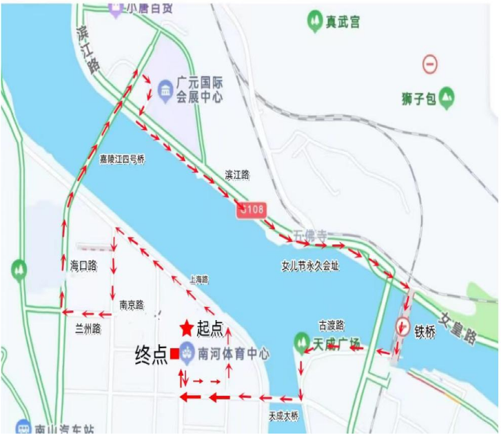 利州区南河全民健身中心体育场(起点)→成都路→上海路→南京街→兰州街→海口路→嘉陵江4号桥→海口路→广元国际商贸中心→滨江路→女儿节永久会址→铁桥→古渡路→天成大桥→利州区南河全民健身中心体育场(终点)