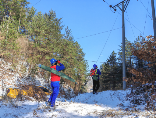 气温零下8℃,积雪覆盖着崎岖的山路,巡视车难以前行。沟沟坎坎,路似有似无,原本熟悉的工作场地,已经变得“陌生”起来。平时只需15分钟的路, 三人扛着绝缘操作杆、脚扣、扳手等工具在雪域中艰难穿行40分钟才抵达10千伏曾平线57号杆。