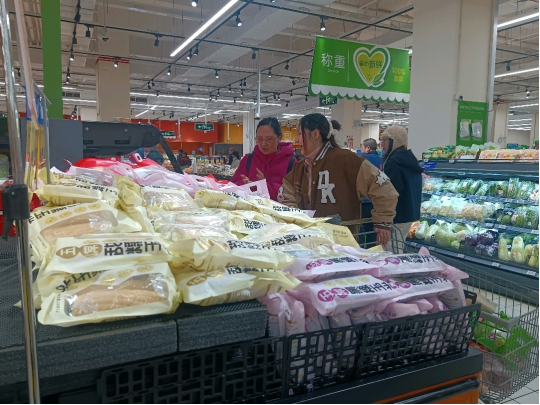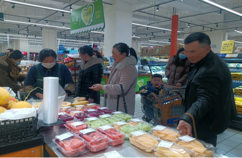 2月4日上午9点,金橄榄广场沃尔玛超市已经开门迎客,不少市民前来光顾。记者注意到,超市内商品琳琅满目,果蔬、粮油等区域的货架上货物摆放得满满当当,价格平稳。一些过年走亲访友必备的牛奶、水果、炒货等食品礼盒已经摆在了超市最显眼的位置,方便消费者选购。