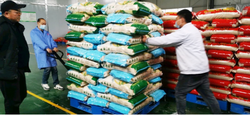“这个搬运工具是电动地牛液压叉车,每次最多可搬运2吨米。”公司管理人员姜艳说。工人把叉车瞄准堆放成品米袋下方的蓝色托盘,然后不断晃动手柄,很快,垒成小山似的米袋就被工人轻松拖走了。