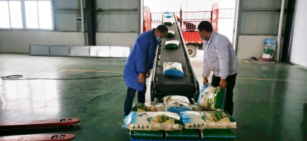 紧挨着加工车间的就是包装运输车间。厂房外,停放了一辆货车,如滑梯般的传送带连接着货车车厢和车间,工人把包装好的大米放上传送带,货车车厢里工人忙着卸货,垒成小山似的米袋几分钟传送完毕。运输工人迅即转身拖着一个红色如“蛙式车”的搬运工具转回搬米。