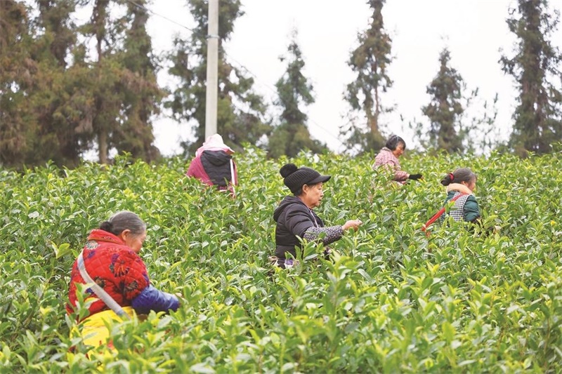 巍巍高山云雾缭绕,漫山遍野茶香四溢,采茶女在茶树间走走停停,一双双巧手在嫩绿的茶树和竹篓间来回翻飞。这是旺苍县木门镇亭子村绿茶基地一景,此时正值基地春茶首次开园采摘。