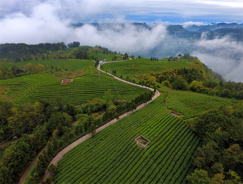 群山连绵,松竹为伴,茶梯层叠,山被茶包围,茶将山浸润,这里是产茶历史悠久的旺苍县米仓山。