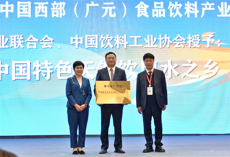 (中国轻工业联合会为广元授牌“中国食品产业名城”“中国特色天然饮用水之乡”。)