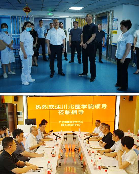 川北医学院发展规划处、校地合作处、研究生工作部、教务处相关负责人等一行7名专家陪同;广元市精神卫生中心党委副书记赵思岗、副主任杨清强、副主任王秀珍及相关部门负责人参加调研交流。