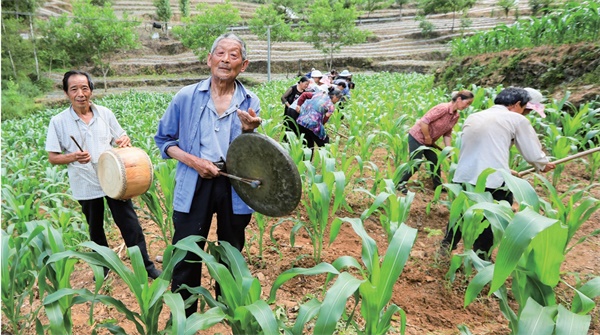 (国家级非遗项目川北薅草锣鼓传承人周永生和村民们一起表演非遗。 段雪朝 摄)