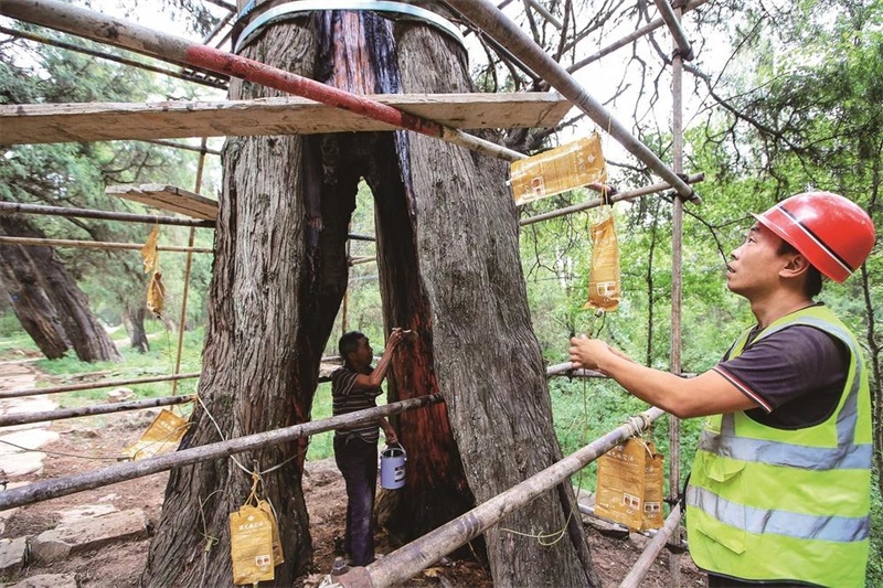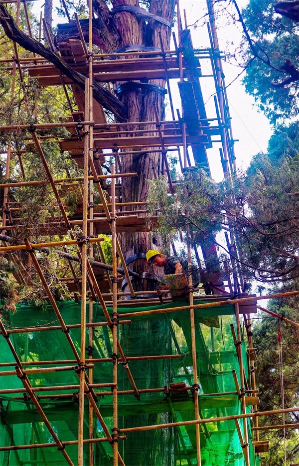 (树龄约2300年的剑阁柏,树高27米,胸围3.7米,立木材积9.82立方米。因其“枝叶如松似柏,远看似松,近看是柏”,百姓称为“松柏长青树”,林业学专家命名“剑阁柏木”’,美誉为“国之珍宝”,2018年被评为中国最美古树之一,2020年入选四川省“十大树王”。图为古树保护人员正在对树干进行保护处理。唐彪 摄)