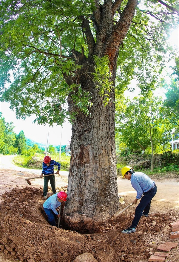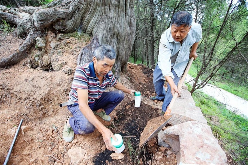 (古树保护人员给病危古树培土培肥,砌堡坎保持水土。刘仁 摄)