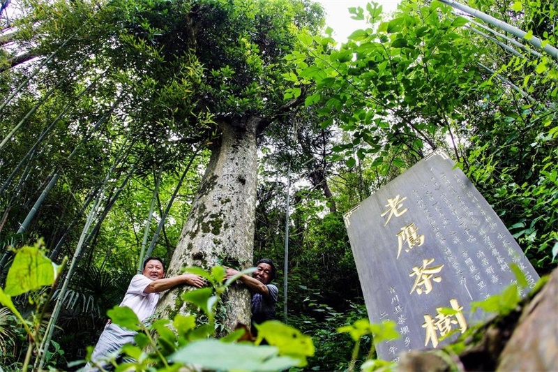 (青川县茶坝乡的“老鹰茶树王”。树龄约1200年,树干直径约1.1米、高15米以上,树冠直径达12米,长势繁茂。唐彪 摄)