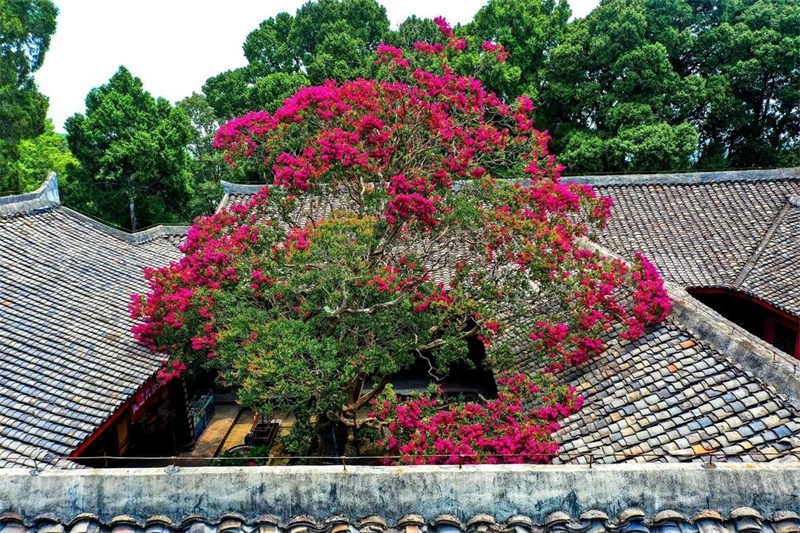 (剑阁县剑门关景区梁山寺院的紫薇树,树龄约1500年,树高12.8米,胸围2.08米,树冠9米,树干虬劲有力,花枝茂盛。紫薇树在中国文化中具有吉祥、长寿象征意义。刘仁 摄)
