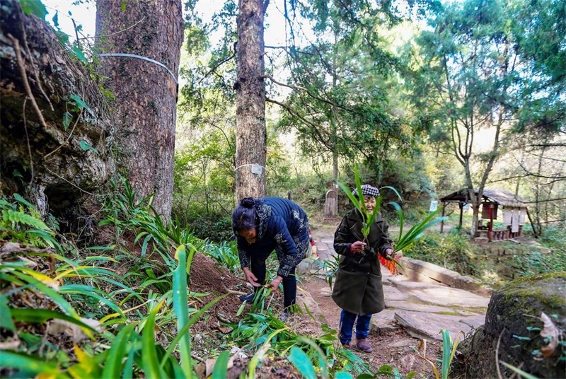 (昭化区昭化镇松宁村,当地群众在两株铁坚油杉树下栽种鸢尾(当地叫扁竹根),推动“一树一策”抢救复壮措施落实落地。唐彪 摄)