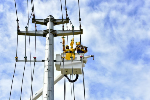 高温、高负荷运行下,供电线路设备的“健康”状态尤为重要,无论温度有多高,电力“蜘蛛侠”一步步攀爬上电线杆顶部,在高空中进行导线及金具更换作业。