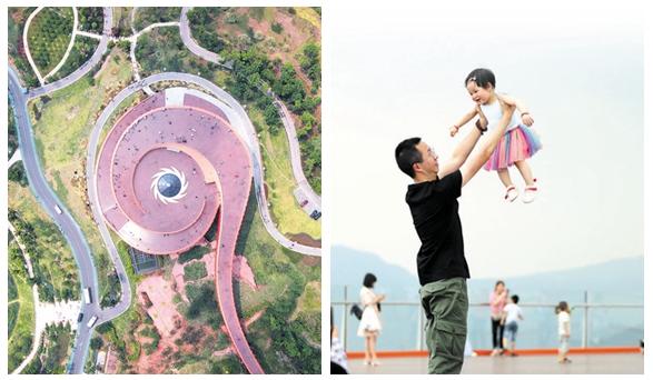 在层峦叠翠中游览观赏 大手牵小手登成都“城市之眼”
