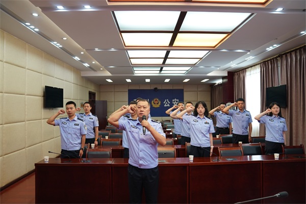 紧接着,在赵海波的领誓下,全体新警面向警旗庄严宣誓。