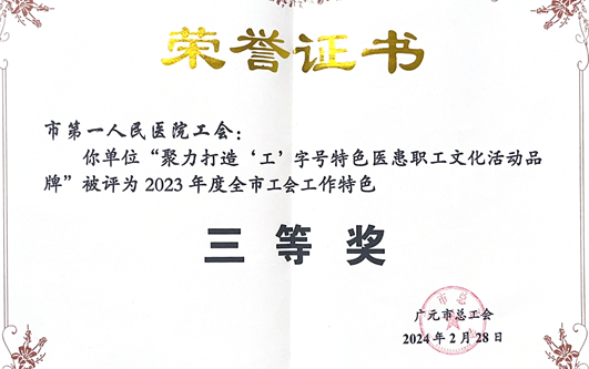 四川新闻网消息(张洁蓉 胡婷 记者 李全民)近日,广元市总工会八届五次全委会召开。会议通报和表扬了2023年度全市工会工作特色创新奖、全市十佳维权典型案例、工会信息工作成绩优异单位和先进个人。其中,广元市第一人民医院“聚力打造‘工’字号特色医患职工文化活动品牌”获2023年度全市工会工作特色三等奖。该院党委委员、工会主席李筠受邀参会并领奖。