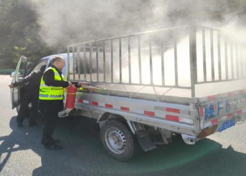 与此同时,吴金凤迅速拿起对讲机,将这一紧急情况报告给了监控中心和值班站管,请求支援。另一边,入口收费站的收费员王阳泽曦也注意到了这一异常情况,他放下手中的工作,拿起最近的手持式灭火器,以最快的速度冲向着火车辆,对着起火点进行初步扑救,有效控制了火势的蔓延。